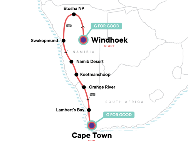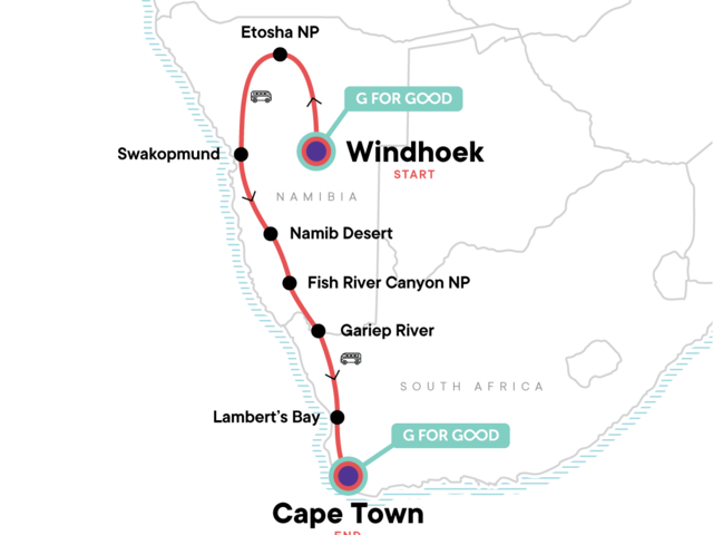 Your Discover Moment: Swakopmund. Etosha National Park entrance with wildlife safari drives in the touring vehicle. Sossusvlei Dunes and Sesriem Canyon entrance. Fish River Canyon entrance. Wine tasting in Lambert's Bay. All transport between destinations and to/from included activities.