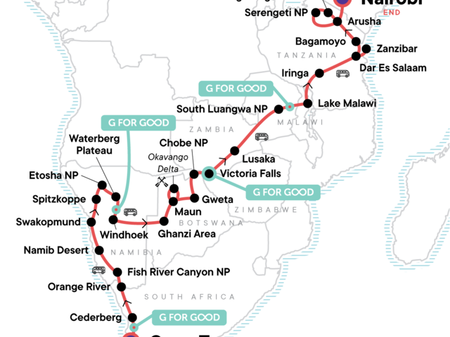 This trip is done a combination of vehicles - a larger 24 seat overland vehicle named the Lando for most of the trip, and in private 6-7 seat safari vehicles for the safari section in Tanzania. Both styles of vehicles have their advantages - the Lando allows the entire group, including your CEO, to travel together, and sits higher, great for wildlife viewing and to enjoy the scenic landscape.