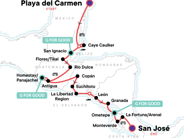 Your Discover Moment: La Fortuna. Guided tour of Tikal. Orientation walks in Antigua, León, and Granada. Beach time in Caye Caulker and El Tunco. All transport between destinations and to/from included activities.