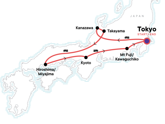 Your Discover Moment: Tokyo. Higashi Geisha District visit. Kenroku-en garden visit. Nagamachi Samurai District walk. Hida No Sato folk village visit. Hiroshima Peace Park and Museum visit. Miyajima Island excursion. Nijo Castle and gardens visit. Kinkaku-ji Golden Pavilion visit. Fushimi Inari Taisha Shrine visit. Lake Kawaguchiko (Five Lakes Region) walk. Kaiseki dinner. Japan Rail (JR) pass (14 days). All transport between destinations and to/from included activities.