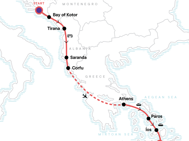Your Discover Moment: Athens. Orientation walks in Tirana, Corfu, Paros and Ios. Internal flight. Free time in Paros and Ios. Half-day Paros beaches tour. Best of beaches tour Ios. Caldera walk in Santorini. All transport between destinations and to/from included activities.