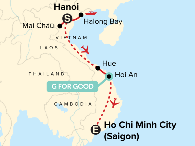 Your G for Good Moment: Oodles of Noodles, Hoi An. Arrival transfer. Visit Hoa Lo Prison (Hanoi Hilton) and Ho Chi Minh Mausoleum. Mai Chau Countryside Hike. Cyclo tour of Hanoi's Old Quarter. Overnight on a junk boat on Halong Bay. Guided tour of Emperor's Tomb and Imperial Citadel Hue. Lunch at a Buddhist Nunnery. Walking tour of Hoi An Old Town. Guided tour of the Cu Chi Tunnels. Internal flights. All transport between destinations and to/from included activities.