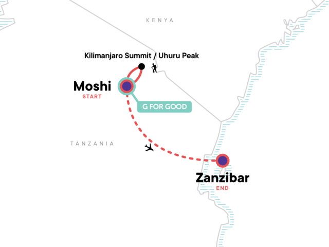 Your Welcome Moment: Welcome Moment - Meet Your CEO and Group. 8-day guided group trek up Mt Kilimanjaro's Lemosho Route with local guides, cooks and porters. Additional "acclimatization day" during ascent. All permits and fees. Scenic flight from Kilimanjaro to Zanzibar. Orientation walk in Stone Town. Spice plantation guided tour. All transport between destinations and to/from included activities.
