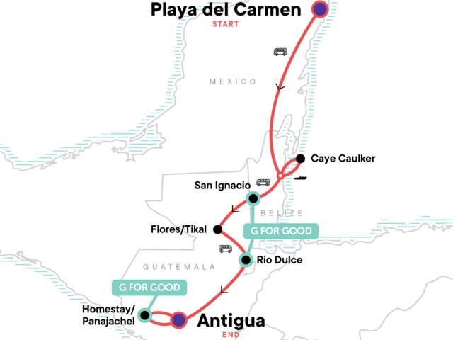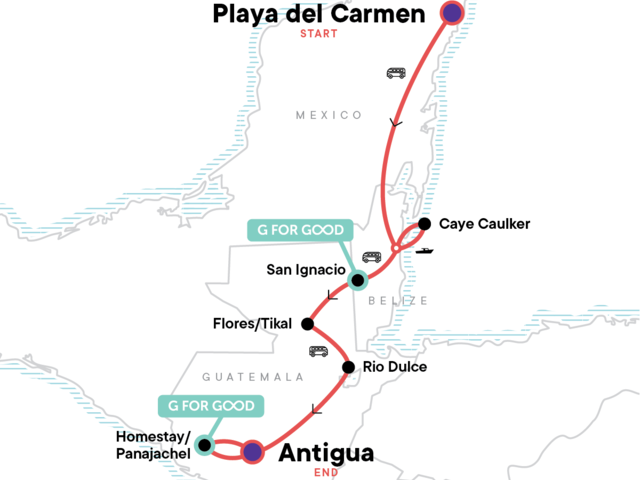 Your Big Night Out Moment: Antigua Guatemala. Guided tour of Tikal. Orientation walk in Antigua. Beach time in Playa del Carmen and Caye Caulker. All transport between destinations and to/from included activities.
