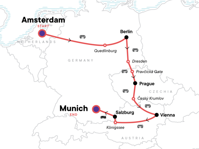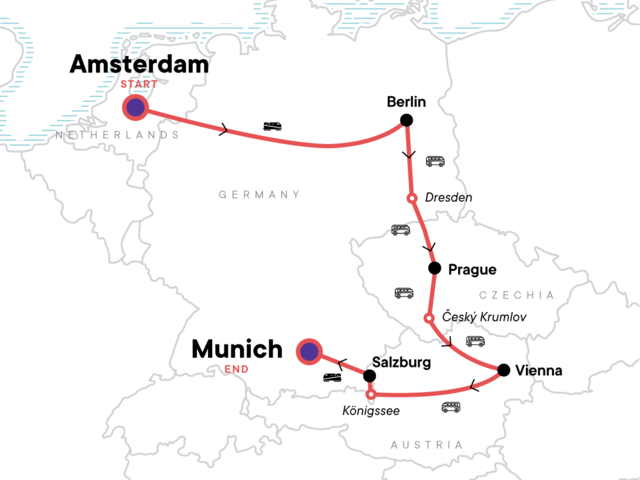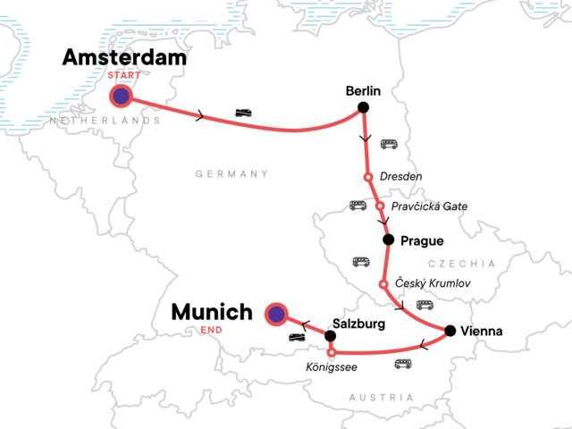 Enjoy a bike tour of Amsterdam, Marvel at the Pravčická Gate natural rock arch, Take a hike along a gorgeous lake at Konigssee near Salzburg, Enjoy free time for optional activities in the major cities.